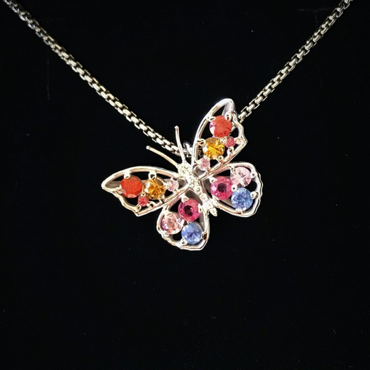Ce papillon en or blanc, serti de diamants et de saphirs, prend son envol en toute légèreté.