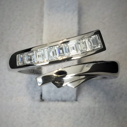 Bague design en or blanc sertie de 8 diamants taillés sur mesure en forme de baguette.